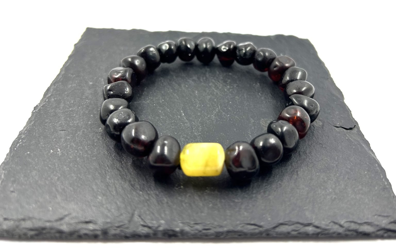 Natūralaus gintaro apyrankė su gintaro statine viduryje ant juodos gumos