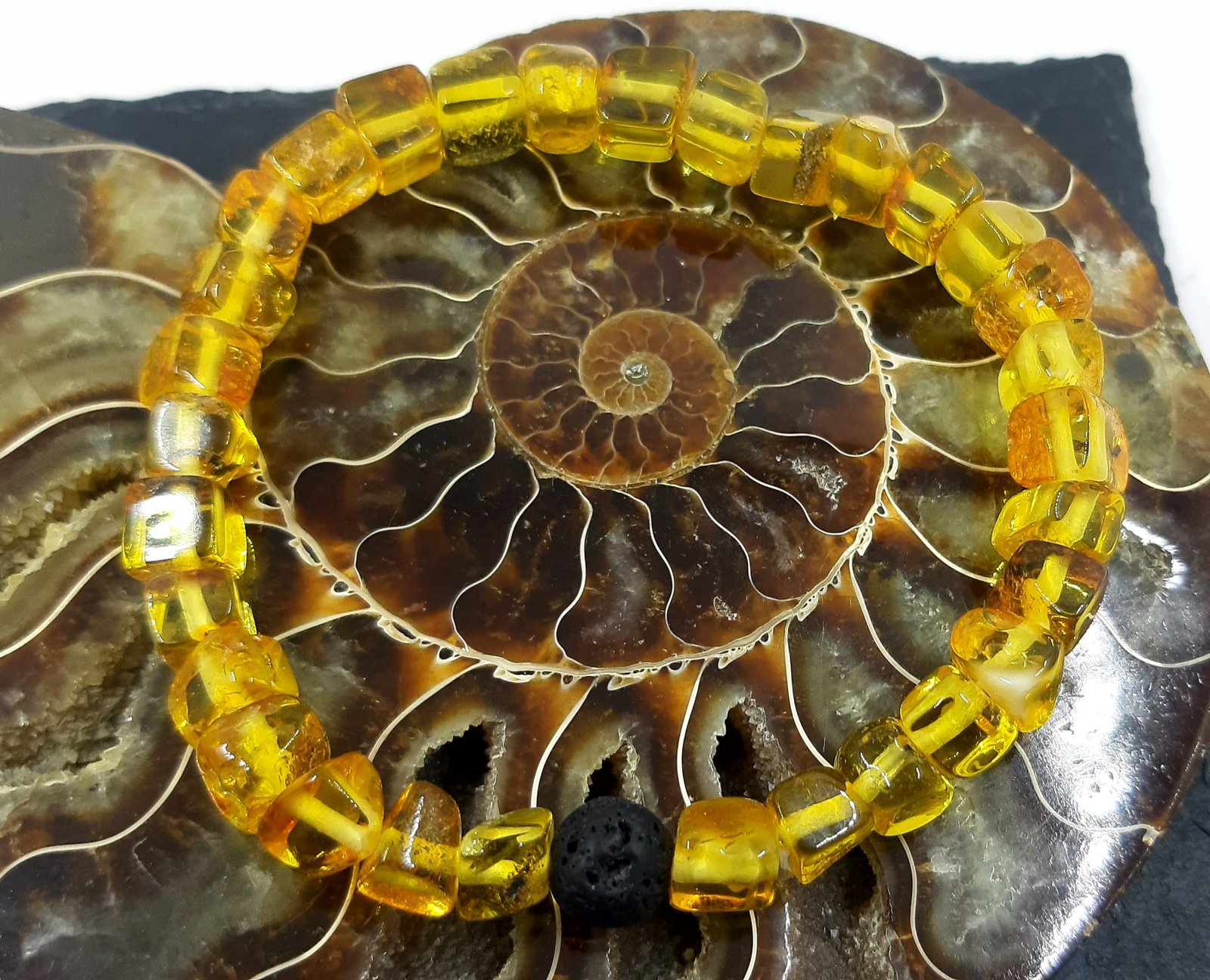 Natūralaus gintaro apyrankė su lava viduryje ant baltos gumos