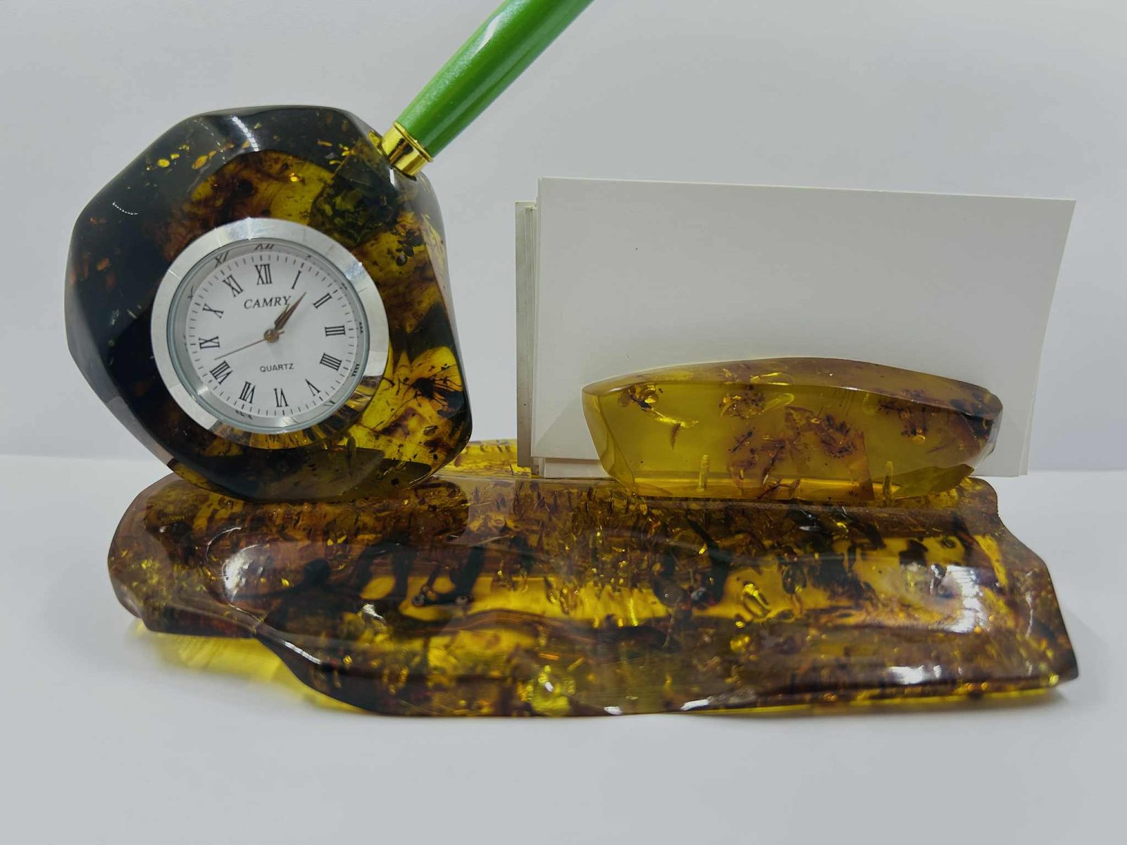 Gintarinis stalinis laikrodis su vizitinių kortelių laikikliu, verslo suvenyras