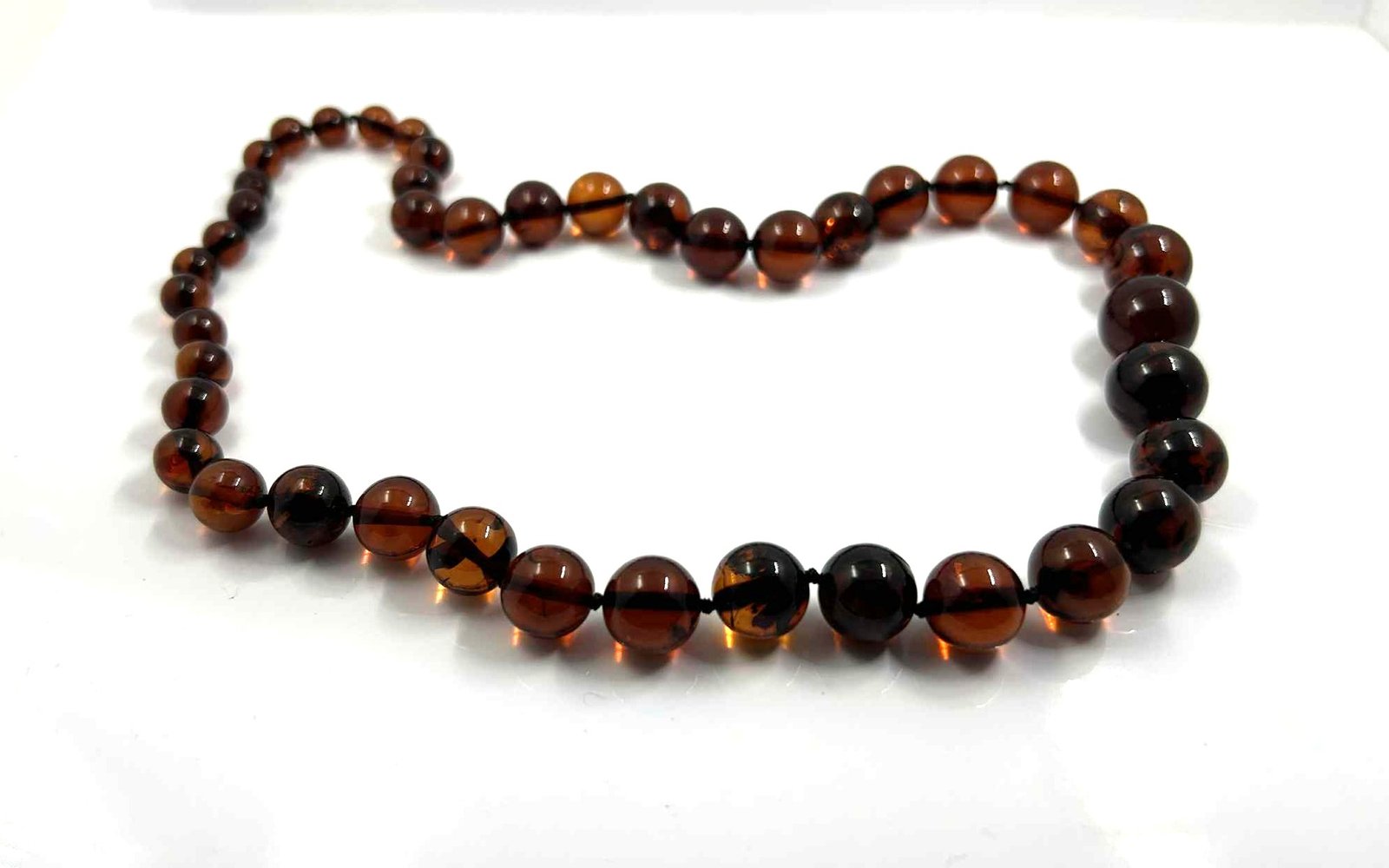 Karoliai iš gintaro rutuliukų, sukurti ant nailono siūlų, tarp kiekvieno gintaro surišti mazgai