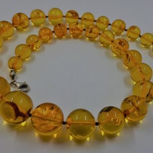 Natūralaus Baltijos gintaro karoliai sukurti ant kabelės, tarp kamuoliukų – maži sidabriniai rutuliukai